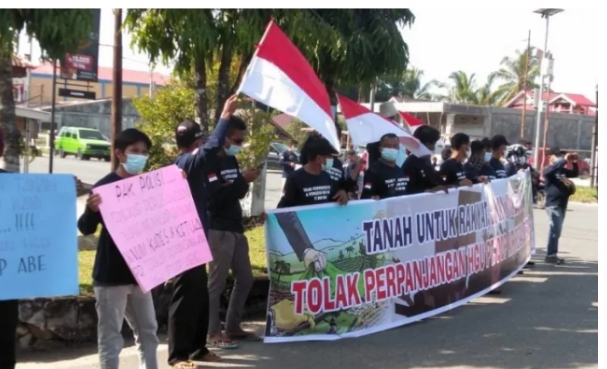 PAGUCINEWS.COM = Koalisi Masyarakat Sipil (KMS) Kabupaten Mukomuko melakukan unjuk rasa di depan Kantor Bupati Mukomuko menolak Perpanjangan HGU HGU PT Daria Dharma Pratama, Selasa (22/3/22).