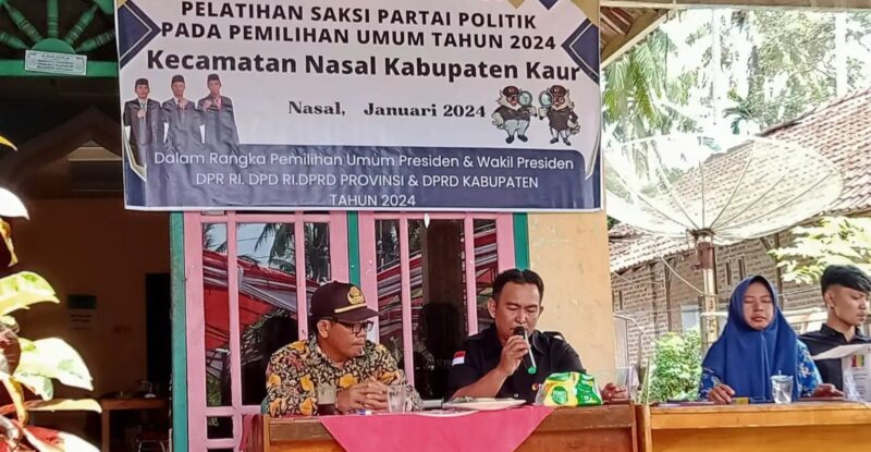 PAGUCINEWS.COM – Sekretariat Pengawas Pemilu Kecamatan (Panwascam) Nasal Kabupaten Kaur melaksanakan pelatihan terhadap para saksi partai politik yang mengikuti pemilu 2024 sebanyak 18 saksi partai politik.