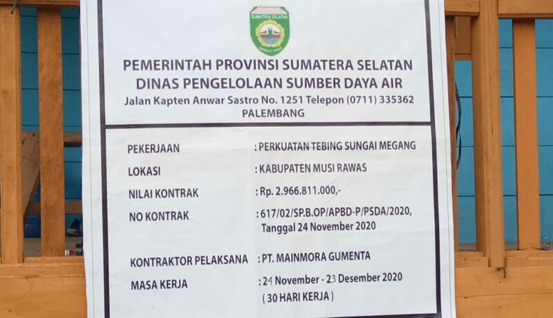 Proyek senilai Rp. 2.966.811.000,- ini, merupakan proyek Pemerintah Provinsi Sumatera Selatan melalui Dinas Pengelolaan Sumber Daya Air (PSDA) dengan masa pengerjaan yang dijadwalkan sejak 24 November hingga 23 Desember 2020.